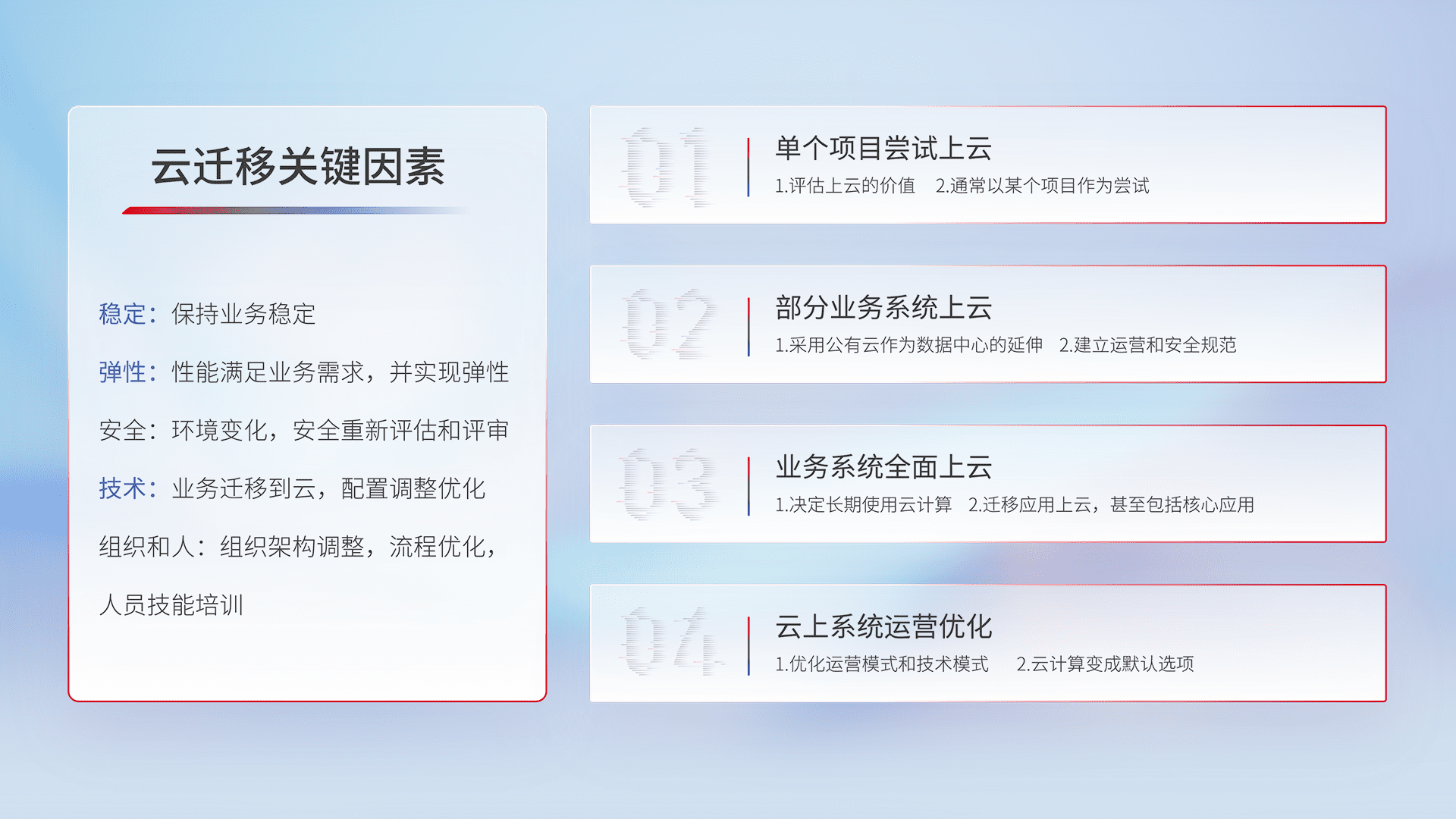 结合实际业务,,,,从规划设计、、、云平台选型、、云原生改造、、、数据迁移、、集成交付,,,,迁移全过程为客户识别最佳上云路径,,,,做好风险识别管理,,,,设计网络架构、、、身份权限、、安全审计合规、、、、操作审计、、、日志审计、、、监控告警策略、、、、多站点容灾设计等,,,,对云上基础设施进行整体规划,,,,提升IT治理水平,,,以满足弹性、、、、高可用、、高性能的需求。。