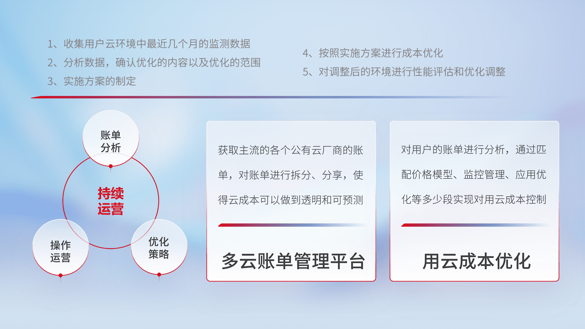 通过多云纳管,,以统一的资源数据模型把客户的云资源进行抽象和封装,,,进而实现对多云资源的统一操作,,,,保障云资源管理的可靠性、、、稳定性与可用性。。。量身定制化运维内容,,,配置、、、、开发运维、、补丁管理、、、备份、、、监控、、、、认证和访问管理、、、审计和日常巡检等,,,,保障在用云过程中的可靠度,,,稳定度以及高可用率。。。。